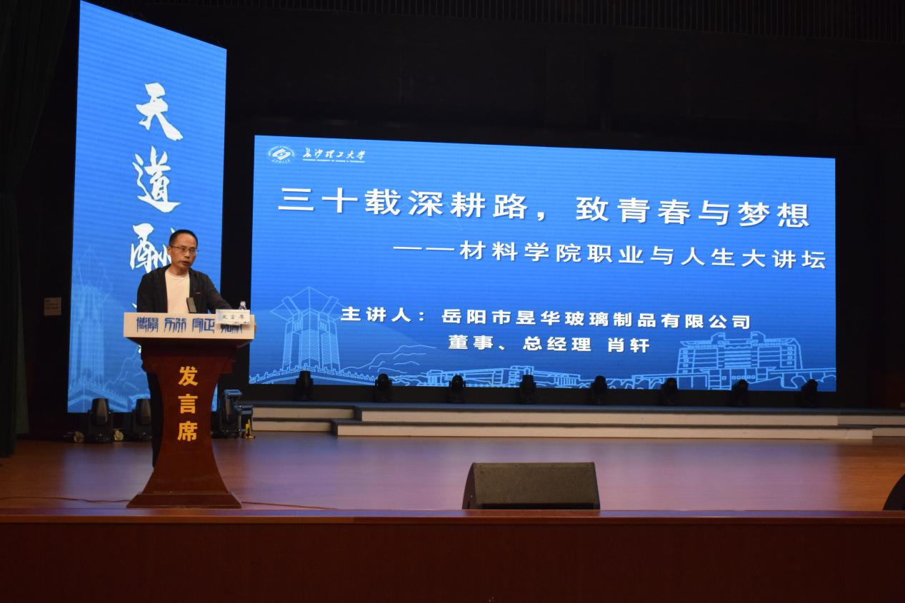 我校89届硅酸盐专业杰出校友,岳阳市昱华玻璃制品有限公司董事、总经理、高级工程师肖轩出席并作《三十载耕路 致青春与梦想》专题报告。
