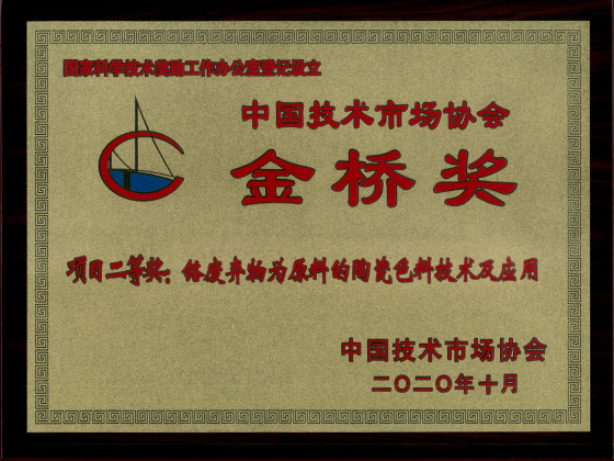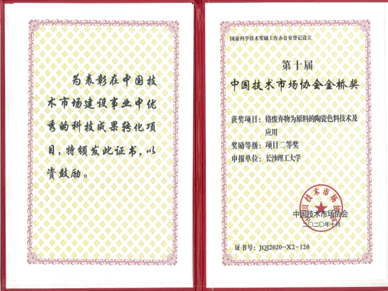 2020年10月22日,中国技术市场协会在山东淄博举办了第十届中国技术市场协会金桥奖表彰奖励大会,我院廖红卫色料团队主持完成的成果“铬废弃物为原料的陶瓷色料技术及应用”继第六届金桥奖后,再次荣获项目奖二等奖,项目第一完成人廖红卫作项目汇报,项目组成员詹文俊代表成果完成团队参加表彰奖励大会。近年来,廖红卫团队与广东佛山天宇陶瓷色料有限公司、江苏拜富科技有限公司等多家公司开展产学研合作,应用我校专利技术,就铬铁合铁制造陶瓷色料及高铬废弃物制造陶瓷色料核心技术产生了很好的社会、经济价值。其中近年来应用铬铁合金制造陶瓷技术生产的主打色料(黑色)占全球市场的60%以上,直接创造税利3亿元/年以上,经济效益及社会效益十分突出。