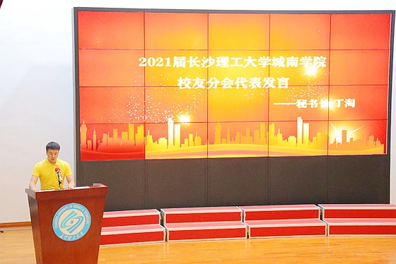 2021届城南学院校友分会秘书长丁淘作为2021届城南学院校友分会代表发言,他为大家分享了个人大学四年来难忘的成长经历与感悟,深入人心,令人振奋,他倡议同学们要传承长理文化,提高本领,勇于担当,在实干中展示长理人风采。