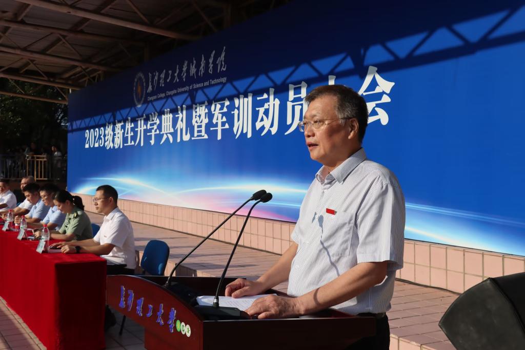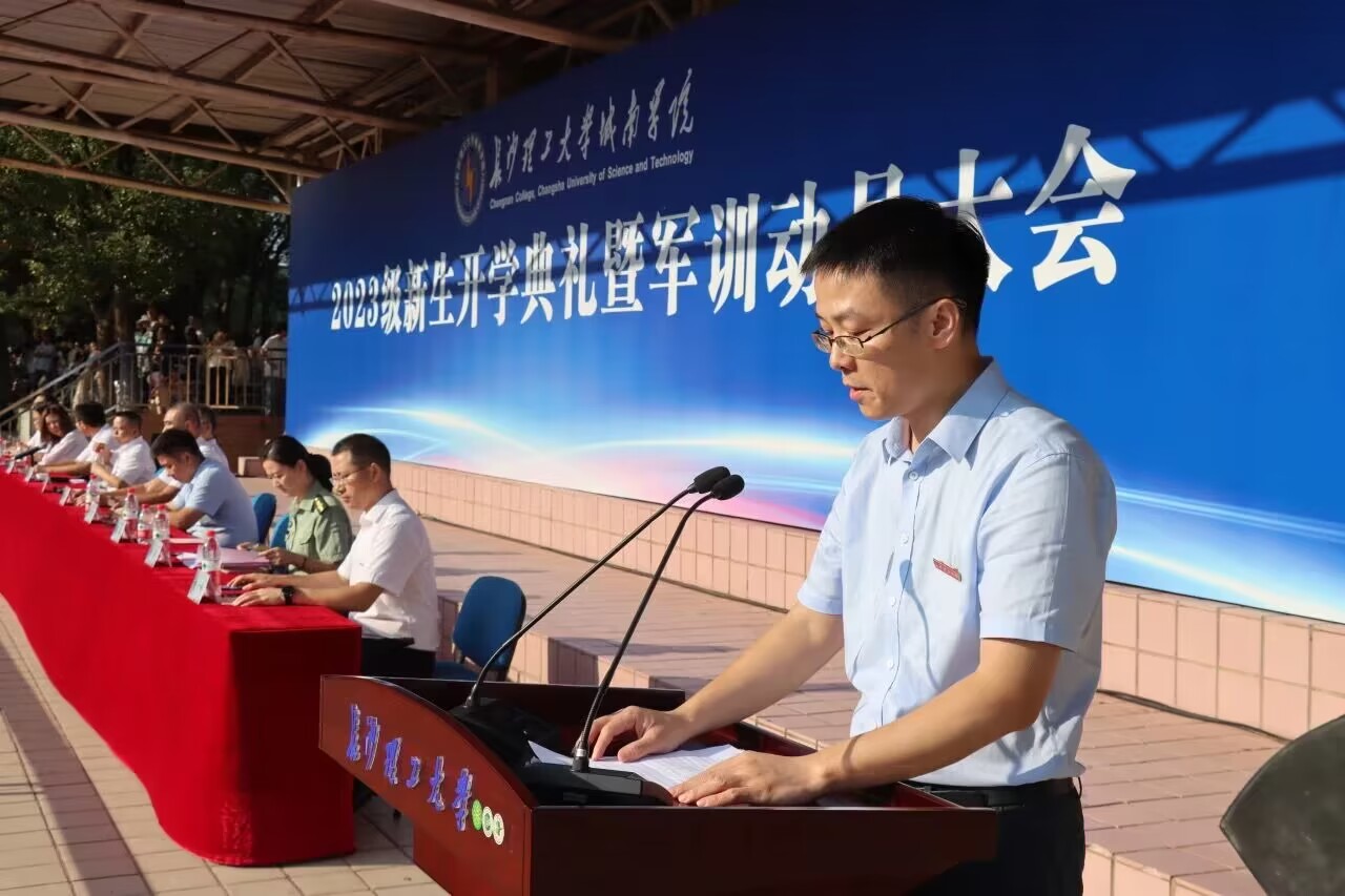 9月17日上午8点,城南学院在金盆岭校区田径场举行2023级新生开学典礼暨军训动员大会。新利官网开户 副校长谈传生,相关职能部门负责人、学院领导班子成员、教师代表、承训教官、学生辅导员以及全体新生参加了大会。大会由院长赵华主持。