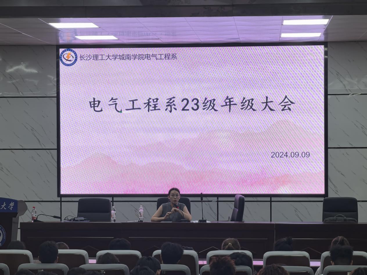 城南学院电气工程系于在四教报告厅召开了23届学生年级大会。本次会议由辅导员向陈老师主持,23级全体同学参会。