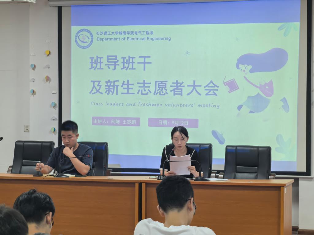 城南学院电气工程系于二教101室召开了2024届迎新志愿者培训大会。电气系学工办主任王志鹏和辅导员向陈主持会议,24届新生班导班干及全体新生志愿者参加会议。