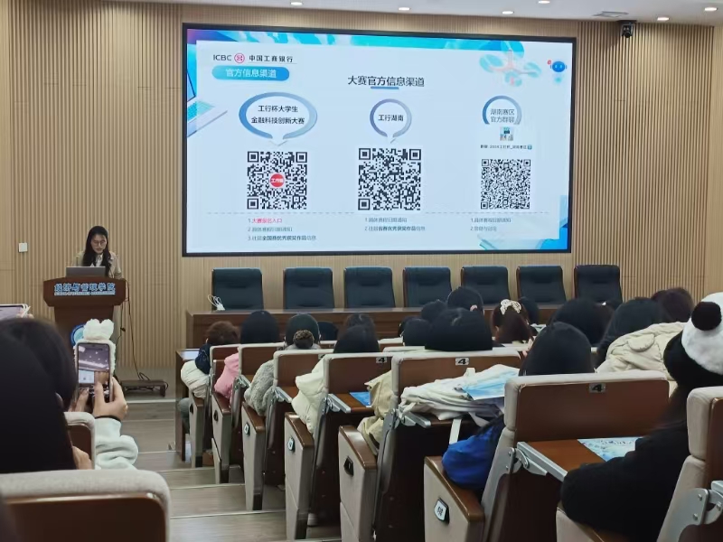 宣讲会上,陈佩经理对“工行杯”全国大学生金融科技创新大赛的背景、目的和赛制进行了详细介绍,鼓励在场的同学们积极参与,将所学知识与实际应用紧密结合,展现自己的创新才华。并且,她以其专业的金融背景和丰富的实践经验,为师生们详细解读了金融科技在当前经济环境中的重要作用和发展趋势,结合实际案例,深入浅出地阐述了金融科技在银行业务中的应用与影响。