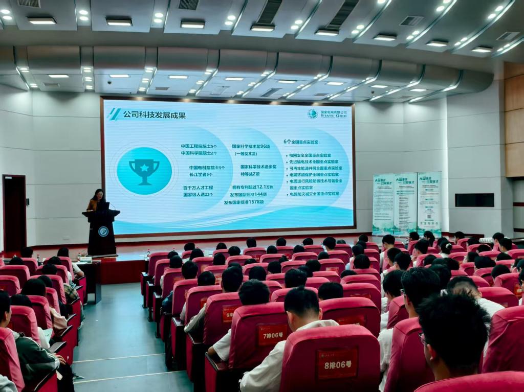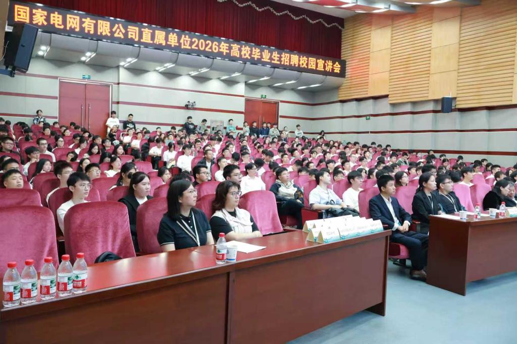 9月22日上午,国家电网有限公司直属单位2026年高校毕业生招聘校园宣讲会在我校云塘校区图书馆报告厅举行。国网人才交流中心顾问赵培胜,学校就业创业处处长田上,电气学院党委书记丁丹、党委副书记周巍,国际工学院党委副书记黄黎明共同出席招聘宣讲会。