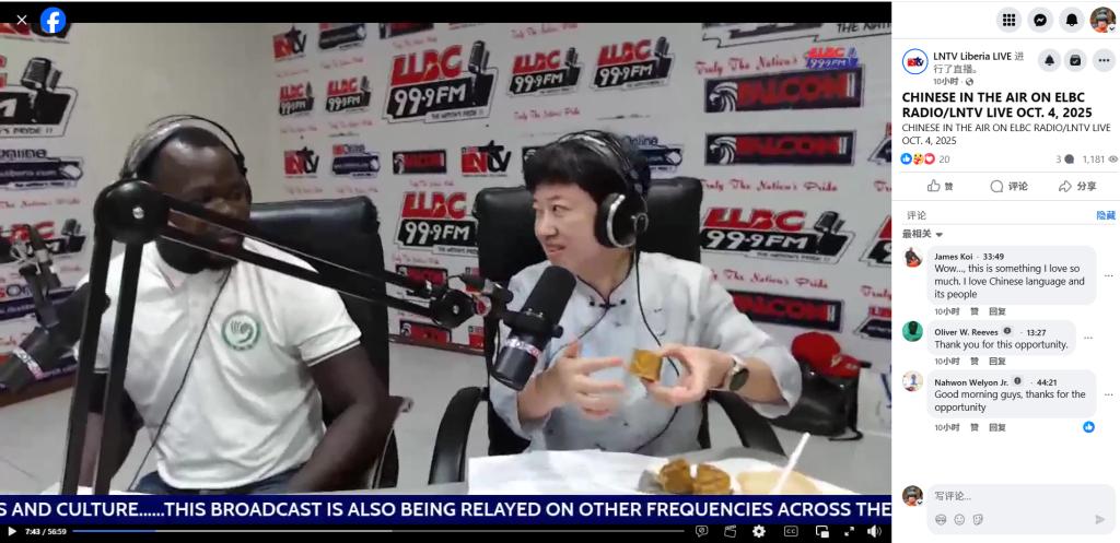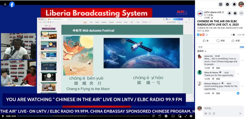 当地时间2025年10月4日上午,利比里亚大学孔子学院在利比里亚国家广播电台推出了《空中汉语》栏目2025—2026学年新一季节目的首播。值此中国中秋节来临之际,本期节目特别以“中秋节”为主题。节目通过利比里亚国家广播电台(ELBC FM99.9)播出,同时在利比里亚国家电视台(LNTV Liberia LIVE)脸书同步直播。