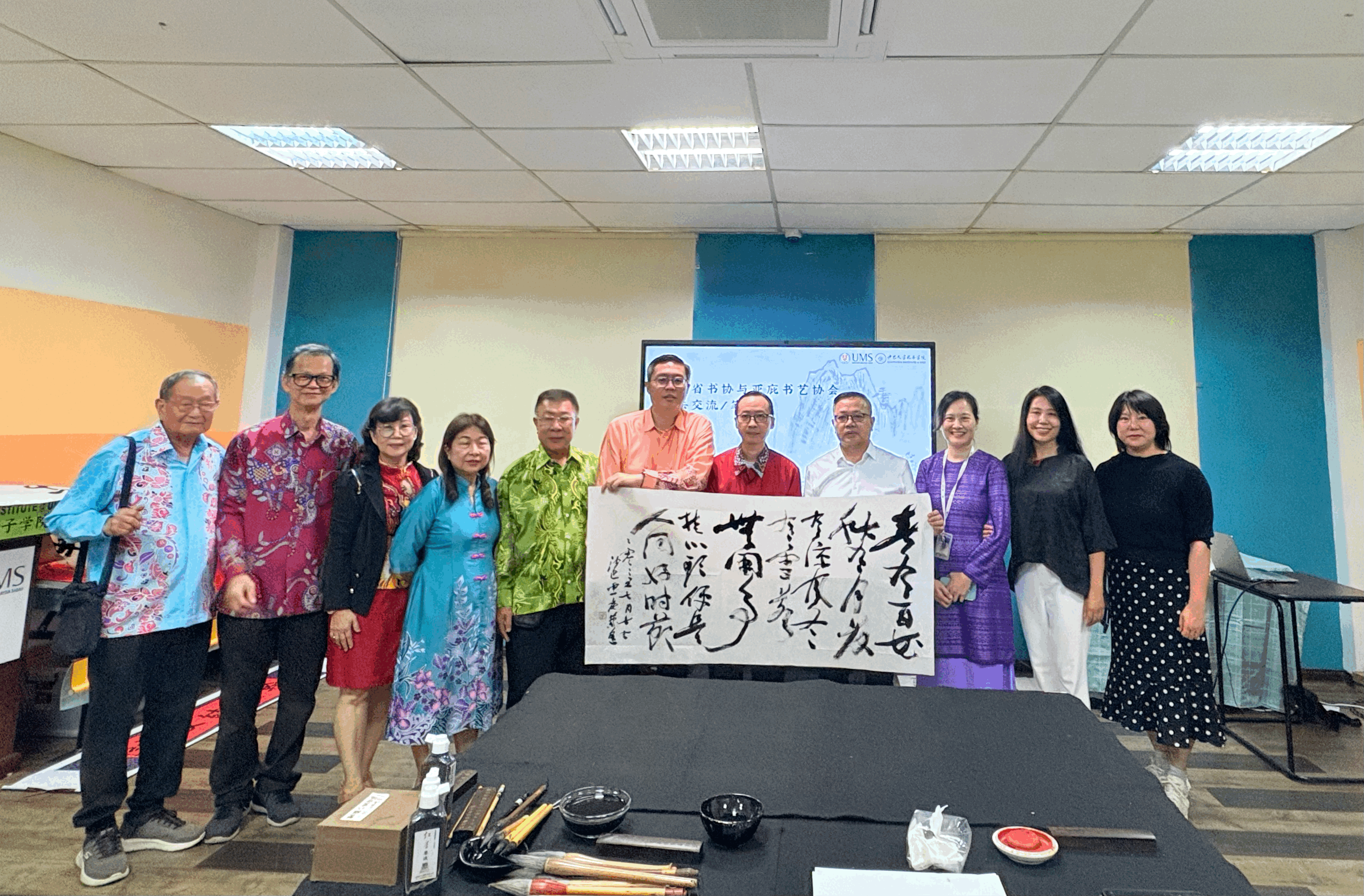 在为期四天的交流活动中,各方围绕书法艺术开展了深入互动:活动在我校共建的沙巴大学孔子学院正式启动。湖南省文联党组成员、副主席、湖南省书法家协会副主席倪文华为孔院师生及当地书法爱好者带来了一场高水平的书法艺术专题讲座。讲座生动阐释了如何以思想力、审美力与实践力为核心来培养书法创作能力,反响热烈。交流团还前往沙巴亚庇书艺协会驻地,与该协会书法家及会员进行了深度的艺术切磋与交流座谈。双方就书法技艺、创作理念、文化传承等议题展开了热烈讨论,气氛融洽。交流团专程到访沙巴州书法教育模范学校——打里卜小学进行考察与教学示范。书法家们现场指导小学生习字,有效激发了孩子们对中华文化的兴趣。由沙巴亚庇书艺协会组织,两地书法家及众多书法爱好者共同举办了一场别开生面的联合笔会。在挥毫泼墨间,艺术家们以笔墨会友,情谊交融,将文化交流推向高潮。交流会上,“沙大孔院书法研创基地”在我校沙巴大学孔子学院正式挂牌成立。该基地的设立,标志着两地书法艺术交流合作步入机制化、常态化新阶段。