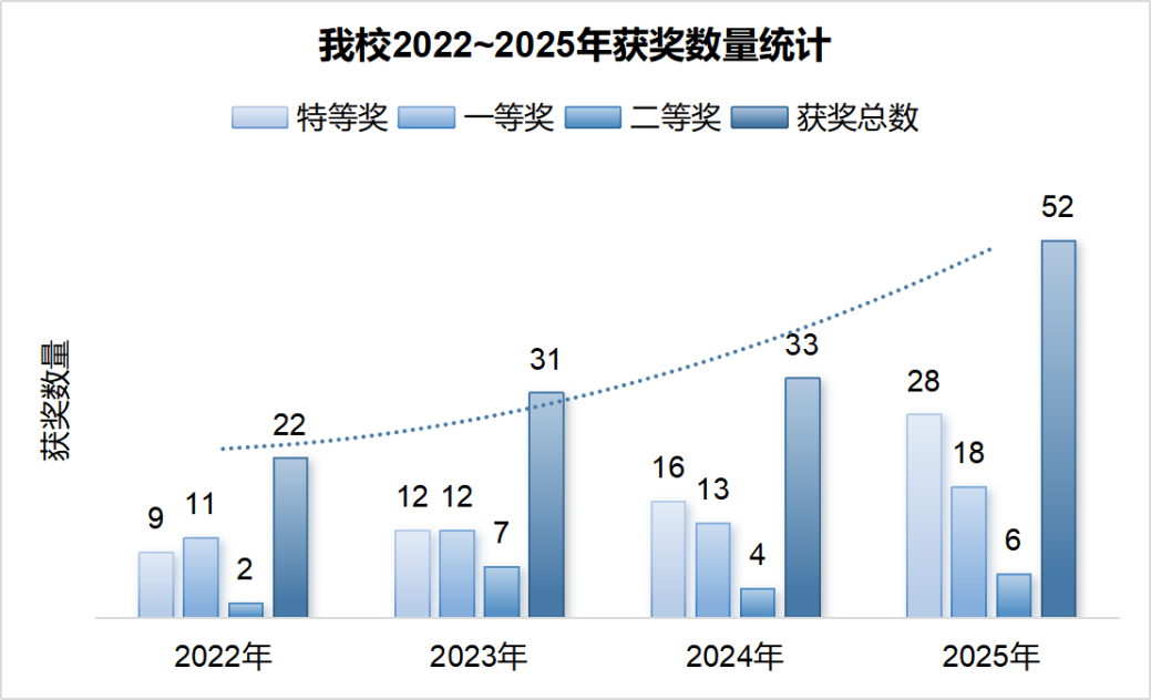 共计获奖52项,其中特等奖28项、一等奖18项、二等奖6项,另12位指导教师获优秀指导教师奖,学校荣获优秀组织奖。据统计,此次我校参赛学生获奖率达66%,部分赛项甚至90%以上获奖,远高于赛事平均获奖率,比赛成绩持续多年稳居全省第一、全国前列。