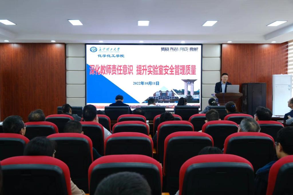 副院长卿志和做了题为《深化教师责任意识 提升实验室安全管理质量》的宣讲,他从实验室安全之痛点、导师安全管理之不足、我院实验室概况三个方面对我院的安全工作做出了部署,并要求全体教职工认真落实好《实验室制度汇编》、《新利官网开户 实验室安全责任追究实施细则(试行)》等制度和文件精神。他代表学院与相关教师签订《化学化工学院2022-2023学年实验室安全责任书》,并强调,导师是实验室安全事故的重要责任人。卿志和通过列举事故案例,为全院教职工敲响安全警钟。