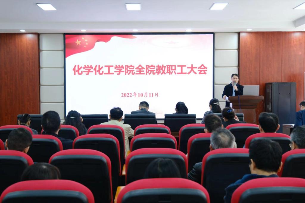 10月11日下午,化学化工学院在工科三号楼A320会议室召开全院教职工大会,学院党政领导班子和全体教职工参加会议,会议由副院长(主持工作)张跃飞主持。