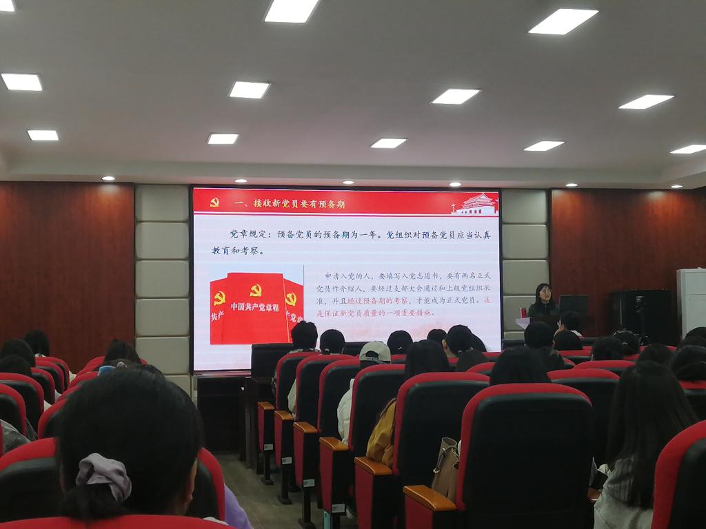 庄奕从“党员预备期的意义”、“党员的教育管理”、“预备党员在预备期间需要注意的问题”、“预备党员转正的程序”这四个方面就预备党员在预备期期间的相关事项展开详细讲解。她以“接受预备党员要有预备期”为切入点,阐述了预备期的存在是为了对党员进行深入教育和考察,进一步提高发展党员的质量。在讲到党员的教育管理时,庄奕结合实例指出政治是一个政党的根本,并号召全体学员读原著、学原文、悟原理,真知真信真行,做到知信行合一,在工作实践中发挥党员的先锋模范作用,争做新时代的青年榜样。