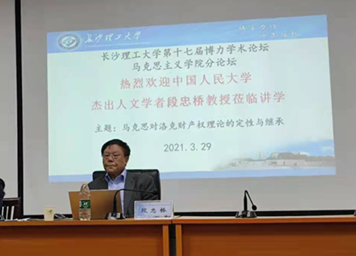 3月29日晚7时,中国人民大学首批杰出人文学者、国务院政府特殊津贴专家、博士生导师段忠桥教授来校,在金盆岭校区2教101,为我校第十七届博力学术论坛马克思主义学院分论坛主讲了“马克思对洛克财产权理论的定性与继承”报告。校党政办主任周艳红,马克思主义学院傅如良教授、余乃忠教授、文贵全博士等教师与学院2020级全体研究生听取了讲座,讲座由副院长李雨燕主持。