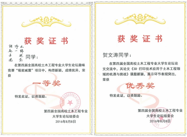 在大学生论文汇报环节,我校提交的4篇(每个学校最多4篇)论文均获优秀论文奖。分别是:土建学院桥梁13-1班贺文涛撰写的论文《3D打印技术应用于土木工程领域的机遇与挑战》(指导老师:付果);桥梁13-1班胡伟业撰写的论文《依托结构设计竞赛,培养大学生创新能力》(指导老师:付果);交通学院道卓14-1班杨卓栋等5位同学撰写的论文《公路下伏溶洞路基填筑技术研究》(指导老师:何忠明),道卓13-1班彭幸海撰写的论文《高强透水混凝土路面试验研究》(指导老师:李九苏)。