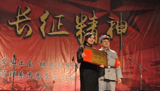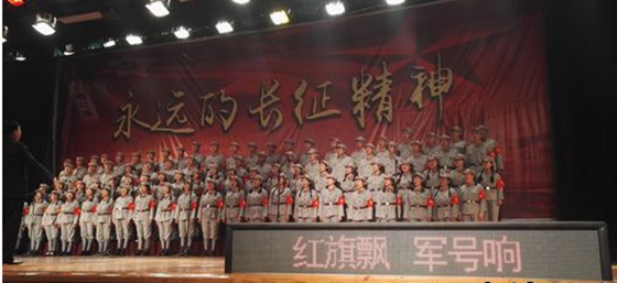 “红旗飘,军号响,战马吼,歌声亮……”12月29日晚上,城南学院在党委书记袁剑波、院长赵华的带领下,全院教职员工与晨曦合唱团的同学们,身着整齐飒爽的红军服,共同登台,共同高声合唱《长征组歌》中的高潮曲目——《大会师》,歌颂伟大的长征精神和伟大的共产党,师生个个身姿挺拔,目光如炬,以饱满的情绪共同绘就了一幅充满正能量的美丽而和谐的画卷,赢得了如雷般的掌声。这是城南学院纪念长征胜利八十周年暨迎新合唱比赛中最令人激动的一幕。著名作曲家杨宙谋先生亲自指挥,青年钢琴家姜微先生钢琴伴奏。