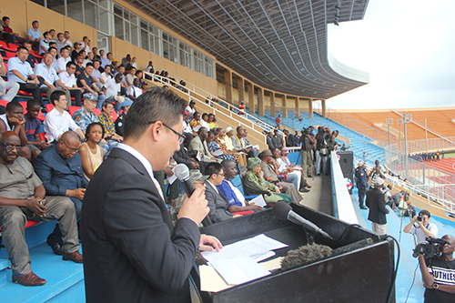 首先,利比里亚青年体育部部长萨•恩托致欢迎辞,郑重表达了对于中国助力利比里亚共同发展的谢意。他指出,中国政府对利比里亚提供的一系列援助,尤其是埃博拉病毒爆发以来,让利比里亚如获新生。体育运动是青年友好交流的一大方面,SKD体育运动场正式投入使用后,必将能促进中利两国的友谊。
