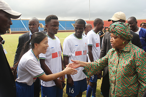 文艺表演结束后,瑟利夫总统在博阿凯副总统和李壮代办的陪同下为SKD体育运动场落成典礼剪彩,宣布SKD体育场正式落成,同时宣布利比里亚大学孔子学院足球队与中国驻利维和警察防暴队足球队的友谊表演赛正式开始。瑟利夫总统亲自为此次友谊赛开球,精彩激烈的国际友谊赛拉开帷幕。最终比赛以1:1结束。赛后,瑟利夫总统与所有球员一一亲切握手,并接见了利大孔院师生。当听到利大孔院足球队队员用中文交流时,她既惊讶又欣慰,自己也情不自禁地用中文向他们问好。瑟利夫总统对孔子学院中方院长黄柏青博士说:“孔子学院的学生中文学得很好,你们的非洲舞也跳得非常棒,你们对中利两国友好交流和发展做出了贡献,感谢你们!”