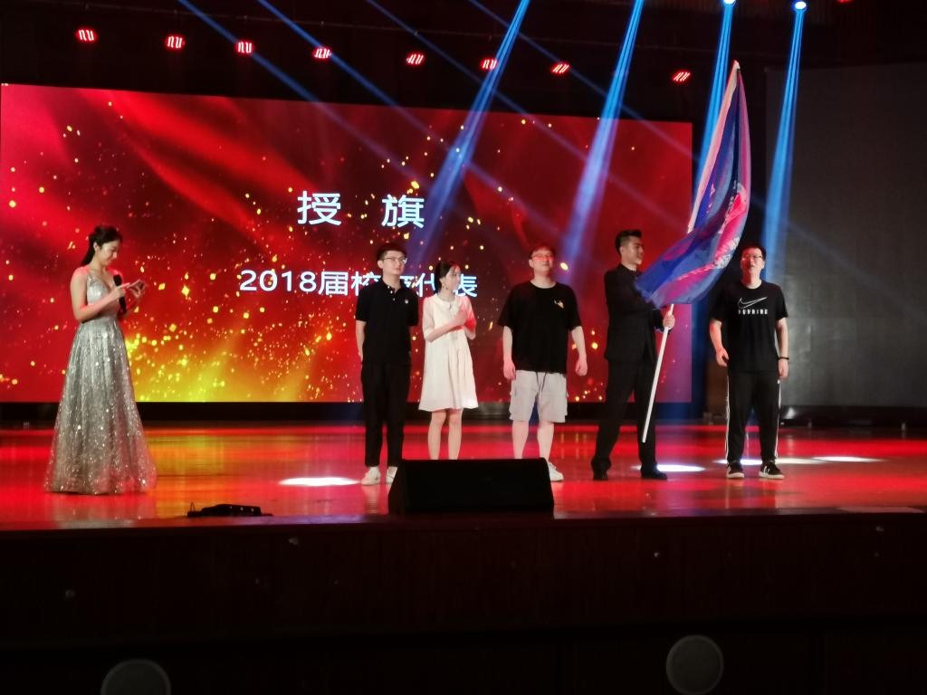 在毕业生们四年大学生活剪影的滚动画面和辅导员祝福的暖场视频中,晚会正式开始。乐队的演出瞬间点燃了整场晚会的气氛,街舞、小品等节目中让毕业生们回忆起初入大学的激情昂扬和青涩懵懂。在校友成立大会上,15级辅导员潘枝花宣读了计通学院2019届校友分会的理事会成员名单,并邀请到场的校友代表沈鑫等3名18届毕业生进行授旗仪式,随后理事会代表曾钊创上台发言,他们表达了进入校友会的激动以及自己对于母校的感谢之情。陈华寄语19届毕业生,希望大家学会感恩和传承,不忘母校母院师恩和同学情谊,毕业后永远都是计通人。