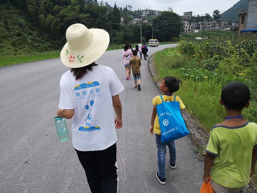 每天送学生回家是最热的也是最辛苦的,同时也是支教队员与学生交流感情最好的时刻。我们戴着草帽,拎着给学生的水壶,保证着每位学生的安全,承担起作为老师的责任。