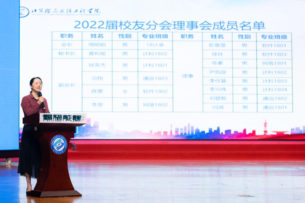 会议伊始,会场播放了“时光记忆”暖场视频,播放同学们在新利官网开户 的青春岁月。随后,王静琦致辞,介绍了学校校友广大的覆盖面以及深厚的情感联系,表达了对学院校友分会的温暖祝福与美好祝愿。孔伟红《宣读计通学院2022届校友分会成立通知》,并表达了对分会蓬勃发展的期许和对全体毕业生的温暖祝福。紧接着进行了授旗仪式及出征宣誓,校友分会全体联络员上台接旗,王静琦进行授旗,分会秘书蒋利杨带领全体同学进行宣誓。校友分会会长周明韬发言,他发出两点倡议,一是铭记学校文化,秉承学院精神,不断提升自我;二是加强与校友会的沟通与联系,为母校的发展献计献策。张锦宣读了《计算机与通信工程学院关于表彰周明韬等优秀毕业生的通报》文件,随后大会为获得毕业生先进个人的优秀同学颁奖,全体领导老师上台为毕业学生送上了祝福。会议最后进行毕业教育,郑国义着重强调了安全问题。
