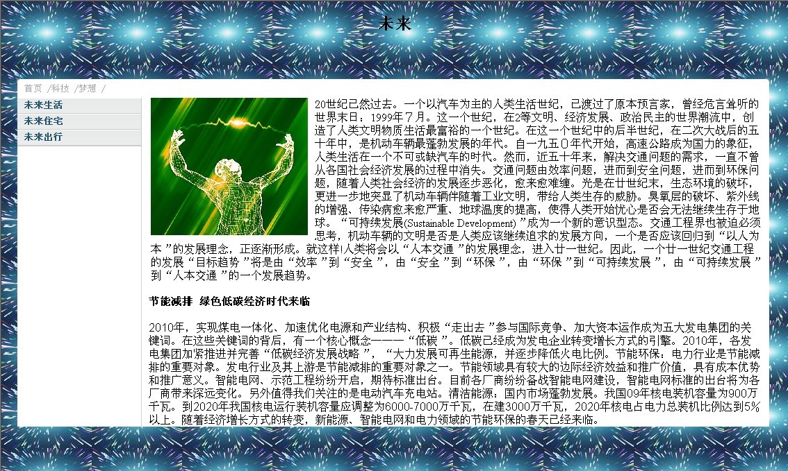 为丰富学生的校园生活,普及计算机技术,推动多媒体网页的应用,培养学生创新能力,让网络科技走进学生生活,用科技点亮青春,学校于2010年5月底—6月底举办了以“科技未来 梦想”为主题的首届网页设计大赛。