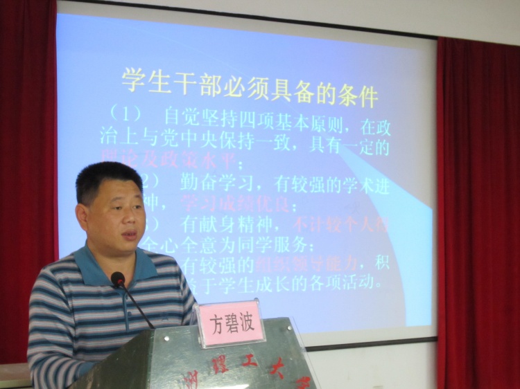 方碧波副书记充分肯定了分团校成立的意义和工作,并为全体成员上了团校培训班的第一节课——《加强能力素质培养,促进学生干部队伍建设》。方书记分别从什么是学生干部、学生干部任职条件、学生干部的义务和权利、目前学生干部队伍存在的问题以及怎样成为一名优秀的学生干部等方面做了详细的介绍和说明,让同学们明确了作为学生干部的责任和义务,为同学们成长为优秀的学生干部指明了方向。最后,方书记向全体学生干部和广大同学提出几点希望:一,希望大家加强政治理论学习;二,希望大家发奋学习,掌握科技文化知识,努力成才;三,希望大家树立自立自强精神不断加强创新意识培养,以崭新的精神面貌迎接21世纪的挑战;四,希望大家自觉培养奉献精神,努力营建良好的人际关系;五,希望大家加强学生会组织自身建设 ,努力成为服务学生的新型纽带。