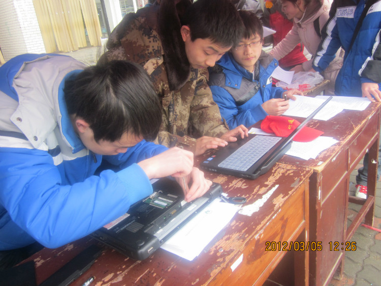 上午在汀香园前坪,青志协的工作人员就开始搭帐篷,搬桌子,布置场地等准备工作,午饭过后陆续有同学将出了故障的电脑带到现场维修,工作人员细心的维修一台台出了故障的电脑,切实为大家解决了例如显示器黑屏、硬件故障,软件修复、调试和安装等诸多电脑故障。部分志愿者们还耐心的发宣传单和义务维修小组的名片,以便大家的电脑将来出故障后及时联系维修小组,整个活动持续到晚上8点,虽然有些志愿者由于维修工作而错过了晚饭时间,但是大家都无怨无悔,任劳任怨的奉献着爱心。