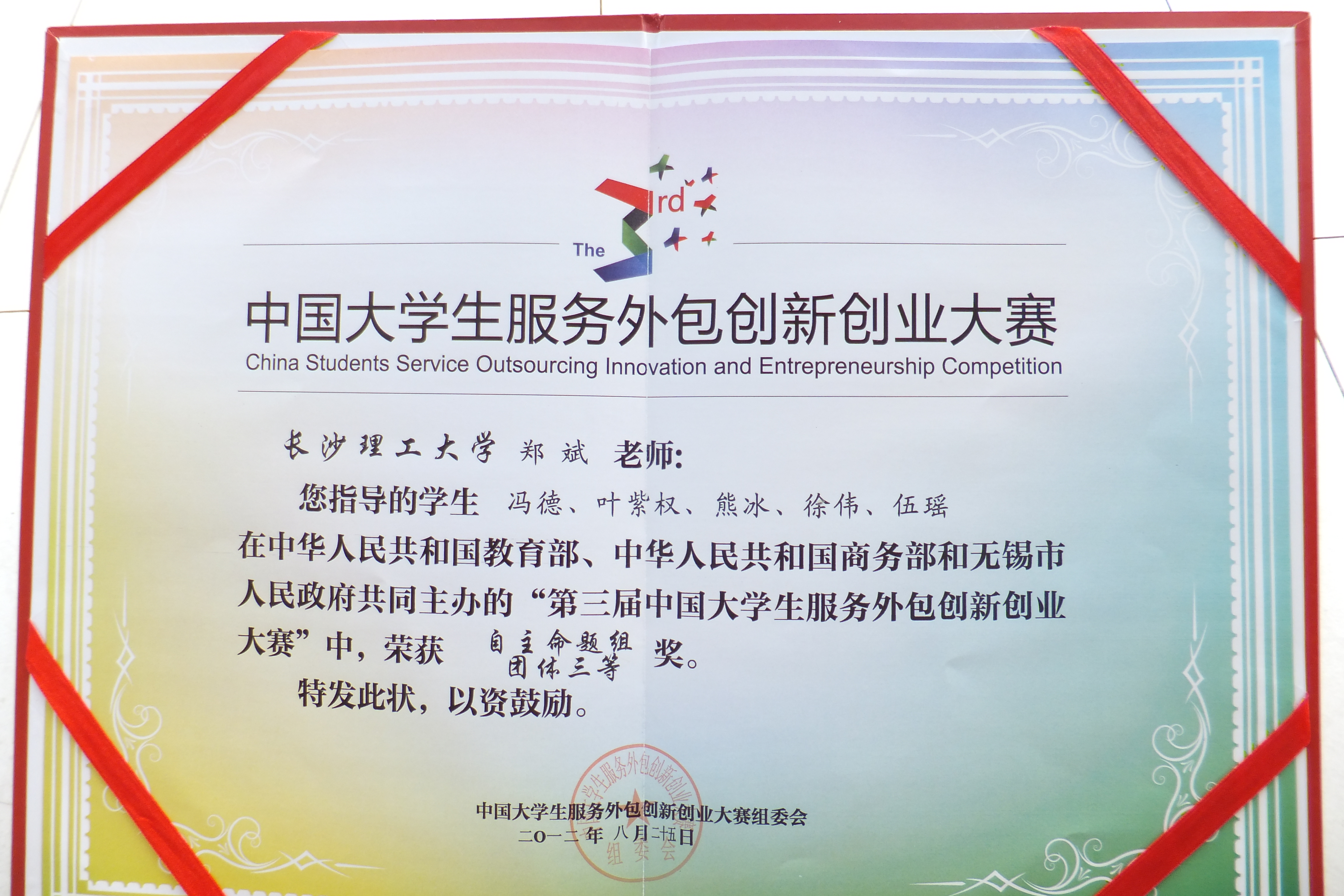 本届赛事以服务经济、信息技术、创意创新创业、应用导向和产学互动为主题,旨在搭建一个大学生服务创新与创业能力展示平台,引导社会公众和青年学生关注现代服务产业,促进高校教育改革,创新人才培养及评价体系,加快服务外包人才培养,为服务外包产业发展提供强有力的人才支撑。清华大学及香港、台湾等158所高校的246支团队、1200多名大学生参加了比赛。最终经过一系列的评审,我校计算机与通信工程学院的5名同学组成的项目团队,在郑斌老师的指导下,斩获本次大赛自主命题组三等奖。