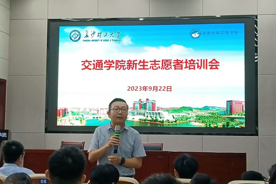 为做好2023级新生的入学工作,9月22日中午,交通学院于云塘校区工二B301召开了2023级迎新志愿者培训会议,本次会议由2023级辅导员潘博洋主持,交通学院党委副书记涂道勇、团委书记彭笠出席,全体迎新志愿者参加。
