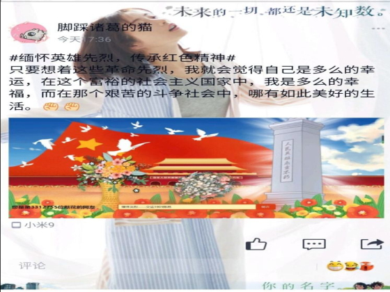 活动期间,交通青年将网络与传统节日相结合,以中华英烈网为平台,通过敬献花篮、感言寄语等方式,深切缅怀戍边英雄和湖湘英烈的丰功伟绩,表达浓厚的敬意与哀思。同时在微信、微博和QQ空间等网络公共平台附上 #缅怀英雄先烈,传承红色精神# 话题分享心得,营造学习英雄先烈事迹,继承先烈意志的良好氛围。交运1901陈昂分享道:“只要想着这些革命先烈,我就会觉得自己是多么的幸运,在这个富裕的社会主义国家中,我是多么的幸福,而在那个艰苦的斗争社会中,哪有如此美好的生活”。此外,交通青年还积极参与以“缅怀英雄先烈,传承红色精神”为主题的征文活动,进一步激发爱国主义热情。