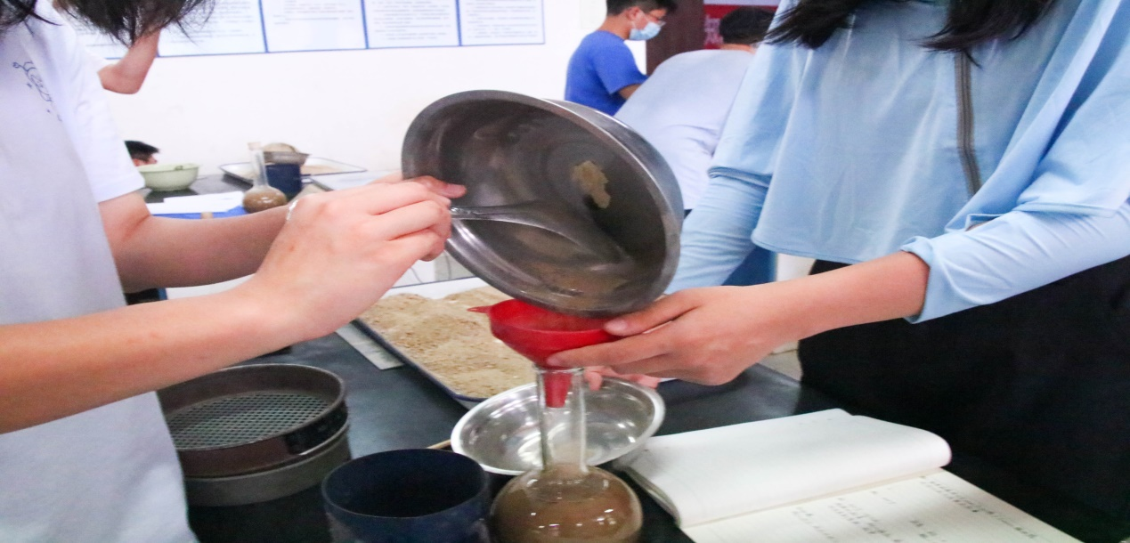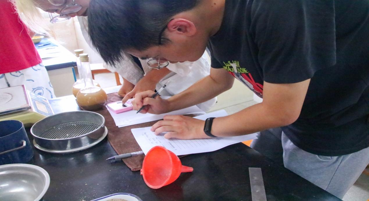 此次决赛以小组为单位进行细集料的表观密度和堆积密度实验,谭鹰现场为参赛选手的实验操作进行打分,选手在比赛完成后需要撰写一份实验报告,并在指定时间地点提交即算完成比赛。竞赛现场,参赛选手们沉着冷静、配合默契。这充分展现了每个参赛选手深厚的基本功。实验完成后,各参赛选手反应迅速,认真细致地填写着实验报告。这是每个参赛选手在本次比赛中交出的以奋斗为底的满意答卷。