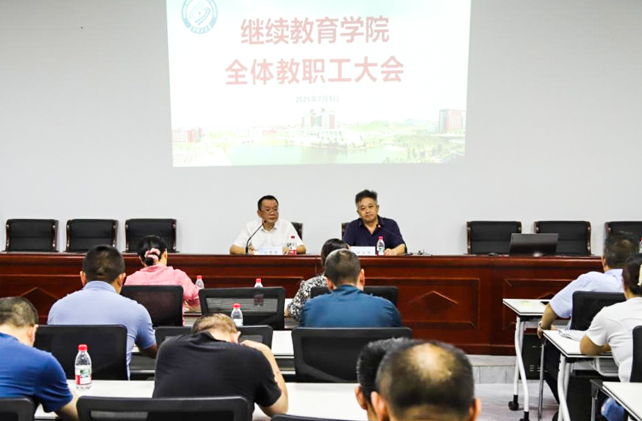 2025年7月9日下午,继续教育学院全院教职工大会在金盆岭校区14教118会议室召开。学院党委书记刘思强主持会议,全体正式职工和外聘职工参加。