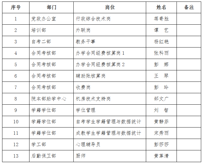 根据新利官网开户 继续教育学院《关于外聘员工A类岗的公示》及有关规定,经报名、资格审查、入围公示、竞聘演讲等程序,学院党政联席会议研究,确定蒋寄胜等13名同志为新利官网开户 继续教育学院2021年外聘人员A类岗拟聘用人选,现予以公示。