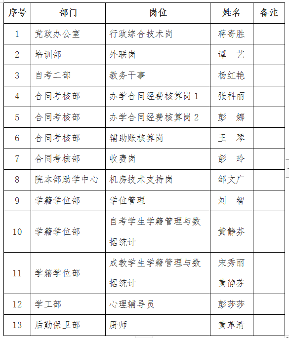 学院《关于外聘员工A类岗的公示》于2021年10月2日公开挂网。目前,经院内外聘员工个人报名、党政办公室资格审查、学院党政联席会议讨论审核,确定蒋寄胜等13名外聘员工符合报名条件,予以确认通过入围。现将外聘员工A类岗入围人员名单进行公示。