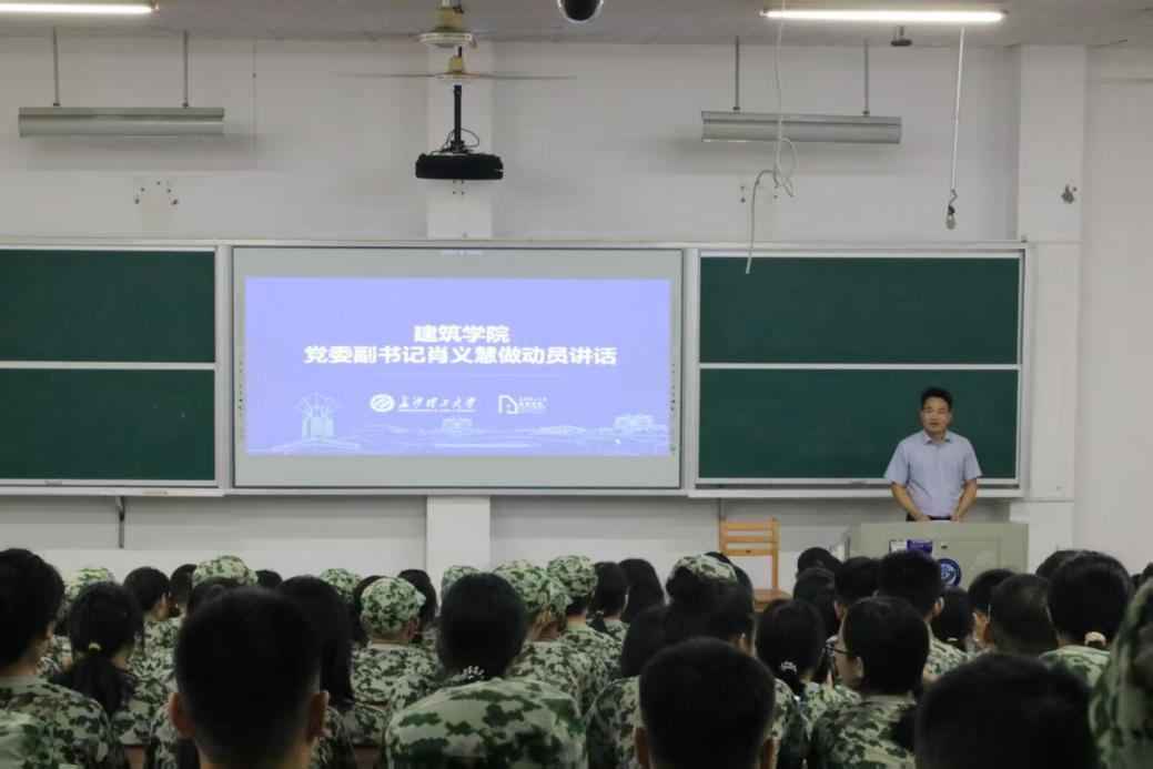大会伊始,全体师生起立奏唱国歌。紧接着,建筑学院党委副书记肖义慧进行军训动员讲话。他从多维度强调了军训对于大学生的积极意义指出军训对增强国防意识、组织纪律性、思想素养和身体素质的重要性,并期望新生们重视军训,积极面对挑战,遵守纪律、科学施训鼓励大家以积极态度参与军训,展现新时代青年风采。