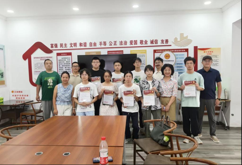 建筑学院联合组织的表彰活动在金科园社区如期举行。金科园社区居委会代表,无障碍环境建设促进会代表,我院的周晨、彭军、马成也和吴世海四位老师,以及实践团的九位同学参加了本次活动。