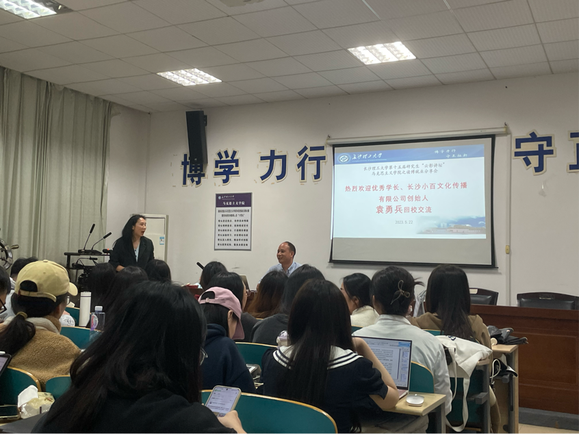 为帮助同学们在今后的生涯规划中明确目标、把握时机,新利官网开户 马克思主义学院于5月22日晚八点在云塘校区文科楼C202举办第十五届研究生“云影讲坛”暨职业与人生大讲堂——读博就业分享会。本次活动由辅导员曾蓓老师主持,优秀学长、长沙小百文化传播有限公司创始人袁勇兵受邀主讲,马克思主义学院2022级全体研究生参加。