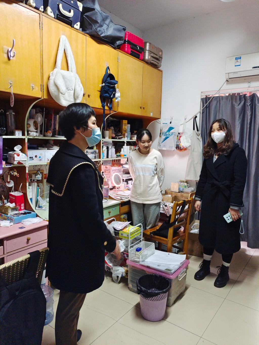 在检查宿舍安全卫生中,老师们与同学们进行了亲切的交流,了解同学们的学习、生活、思想状况,关怀同学们的身心健康,提醒同学们要多通风、勤打扫,保持良好的宿舍环境,还向同学们传达了学校疫情防控的相关规定。检查发现,绝大多数宿舍安全卫生状况良好,但极个别宿舍卫生状况较差,学院对问题宿舍进行情况通报,并要求宿舍尽快整改完毕,年级辅导员督促落实。同时学院还在每个学生楼栋设立了党员志愿者监督岗,对学生进、出楼栋戴口罩情况进行督促,并提醒同学们做好每日体温监测。