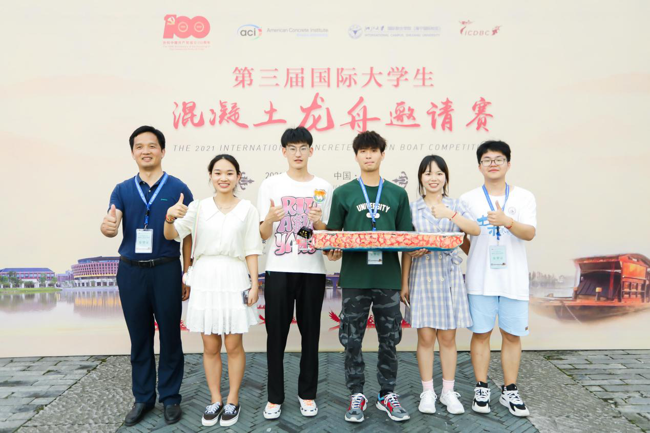 根据竞赛规则,龙舟主要由混凝土材料组成,需要在船上安装发动机和遥感接收设备,考验选手对当今混凝土材料前沿新技术的认识与运用、结构设计和分析计算的能力,还需要发挥跨学科知识想象力、创造力及艺术设计能力。选手们通过遥控指挥龙舟的航行而进行直线竞速PK赛。在直线竞速PK赛中,团队在小组赛中发挥稳定,突出重围,挺进16强PK淘汰赛,两轮PK后进入4强,最终获得了季军奖(第3名)的好成绩。