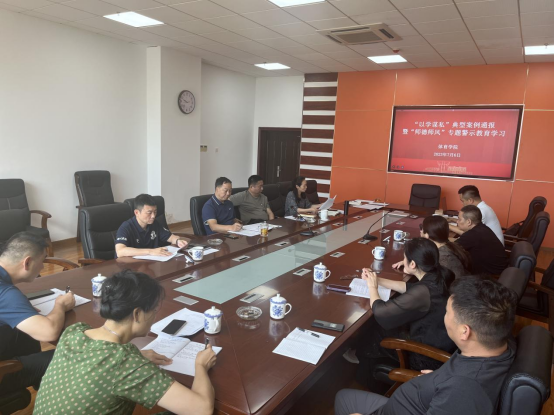 2023年7月6日上午十一点,体育学院在云塘体育馆A306会议室开展“以学谋私”系列典型案例通报暨“师德师风”专题警示教育学习。会议由纪检委员潘红玲副院长主持,学院全体班子成员、各办公室主任、教研室主任、中心主任参加了本次会议。