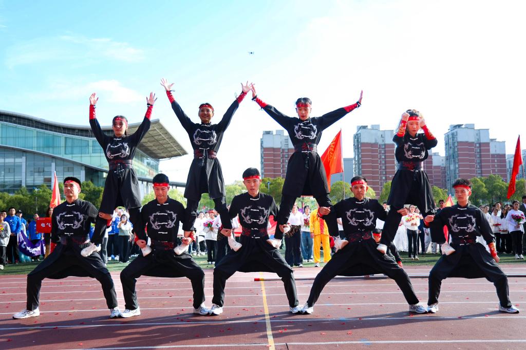 随着《大国工匠,长理担当》的激昂旋律响起,近千名长理学子以大型团体操表演的形式,拉开了开幕式的华丽篇章。他们在绿茵场上翩翩起舞,队形变化多样,既展现了长理学子的热情奔放、坚韧不拔与严谨求实,又生动诠释了当代青年“勇于追梦”、“勤勉圆梦”、“匠心筑梦”的壮志豪情。随后,在《运动员进行曲》的伴奏下,国旗队、校旗队、校徽护卫队及各学院代表方阵依次入场,各学院精心准备的节目轮番上演,精彩纷呈。体育学院教师方阵带来的《群猴欢聚云影湖》,巧妙融合现代拉丁舞、操化技艺与中华传统文化元素,不仅彰显了长理教师传承创新的精神风貌,更将开幕式推向了高潮。