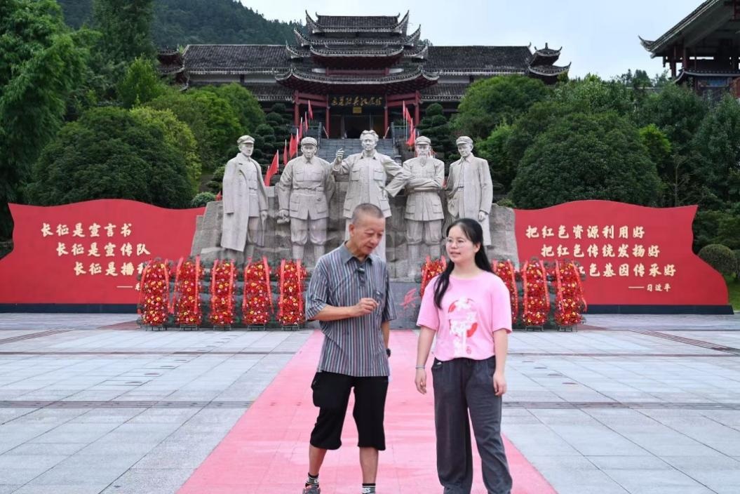 7月23日上午,实践团来到通道转兵纪念馆,采访纪念馆馆长郑湘。郑湘馆长解释道,之所以就把通道转兵纪念馆和会议旧址联系起来,是为了便于开展这个爱国主义教育活动,便于游客参观和缅怀。据郑湘馆长介绍,自纪念馆对外开放以来,每年参观游客逐年递增,近三年来游客人数均在100万人次以上,这不仅促进了当地住宿、餐饮、交通等行业的发展,同时也为周围百姓解决了就业问题。调研发现,为了吸引游客,近年来通道转兵纪念馆创新推出《通道转兵》音乐思政课、国防教育营地体验以及红色情景剧等互动项目,让游客沉浸式体验长征精神。调研期间,团队成员现场体验了音乐思政课,倾听红军在侗乡苗寨留下的感人至深的革命故事。其中,“红辣椒”的故事让成员们感受到了红军“不拿老百姓一针一线”的优良作风,“一担皮箩”的故事让成员们体会到了红军与侗乡人民之间的互相牵挂、难舍难分的深厚情谊。