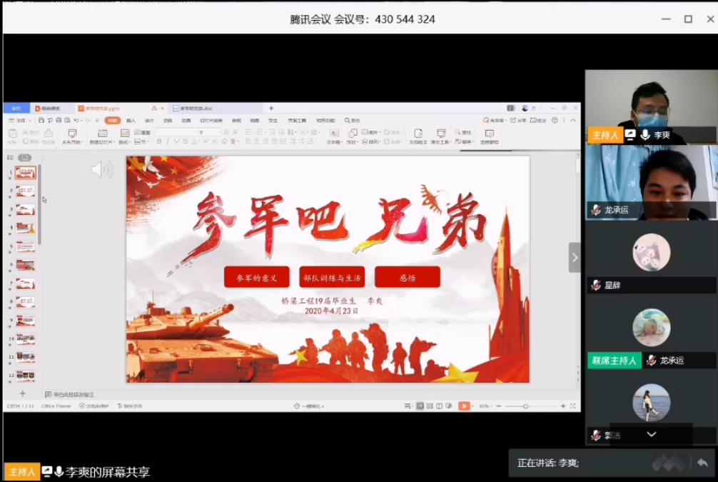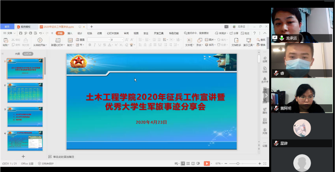 为做好国防教育和征兵宣传工作,进一步增强国防观念,激发广大青年大学生的参军热情,4月23日晚,土木学院线上召开征兵工作宣讲暨优秀大学生军旅事迹分享会。会议由辅导员龙承运主持,院党委副书记(代理)黄阿明,优秀校友刘睿、李爽参加。