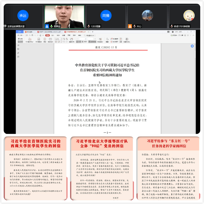 会上,龙承运带领学生党员和入党积极分子重温了习近平总书记在纪念五四运动 100 周年大会上的讲话精神,重点回顾了习近平总书记对新时代中国青年提出的“树立远大理想”“热爱伟大祖国”“担当时代责任”“勇于砥砺奋斗”“练就过硬本领”“锤炼品德修为”六点要求。结合这六点要求,全体参会人员再重点学习领悟“习近平给在首钢医院实习的西藏大学医学院学生的回信”、“习近平给北京大学援鄂医疗队全体‘90后’党员的回信”以及“习近平给参与‘东方红一号’任务的老科学家的回信”中的深刻内涵和重要意义,龙承运结合疫情防控一线青年工作者的先进事迹及其涌现出的无私无畏精神,教导支部全体同学一定要树立真挚的为民情怀、锻造过硬的意志品质、练就超强的工作本领,勇于在党和人民最需要的地方绽放青春。