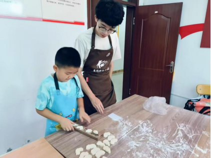“老师,这个是做什么用的呀?”当各式各样的木制榼子模具摆上展柜,孩子们的目光瞬间被吸引,面对孩子们的好奇,王昱辰拿起鱼形模具耐心讲解:“这是咱们传统的榼子,以前家家户户都用它在面点上压出好看的图案!”除了基础课程,王昱辰还为孩子们带来了丰富的课外体验,其中非遗体验环节更是成为暑期课堂的“亮点”在动手环节,孩子们轮流触摸榼子上的花纹,兴奋地分享自己手中模具的造型——“我这只是小鸡!”随后,大家跟着王昱辰学习揉面团、撒面粉,小心翼翼地将面团压进榼子,当印有鱼、莲花等图案的面点成功脱模时,教室里满是“我印出来啦”的欢呼。一位小女孩捧着自己的作品骄傲地说:“我回家也要教妈妈做!”,传统文化的种子在孩子们心中悄然扎根。