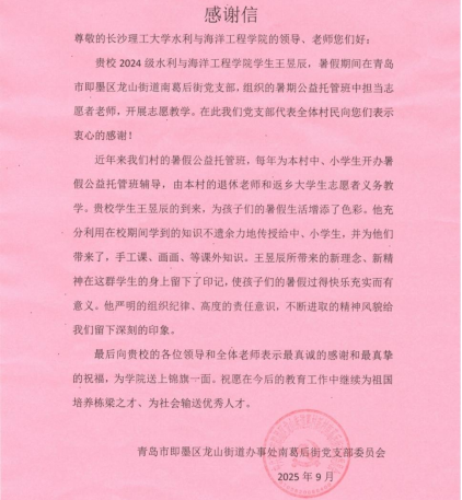 水利与海洋工程学院的感谢和对船海2401班王昱辰的赞誉。这份跨越千里的肯定不仅是对一名学子暑期公益行动的高度认可,更映照出长理学子敢于担当、服务社会的青春底色。