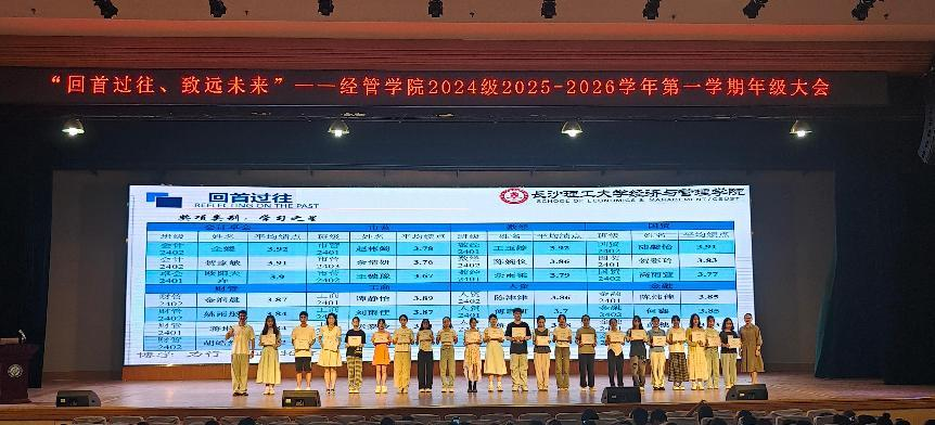 为助力2024级学生锚定新学期目标、做好学业规划,经管学院于2025年9月16日14:00在金盆岭校区五教大礼堂召开“回首过往,致远未来”年级大会。本次大会年级辅导员何艳芝主持,学院党委副书记汪功伟、辅导员钟超和全体2024级学生参加会议。