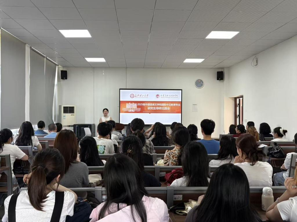 中国语言文学与国际中文教育专业2025级硕士研究生导师见面与双选会在金盆岭校区九教417成功举行,文学与新闻传播学院中国语言文学与国际中文教育专业全体研究生导师及研究生新生参与了此次会议,文学与新闻传播学院党委委员兼中文系主任黄婧主持此次会议。