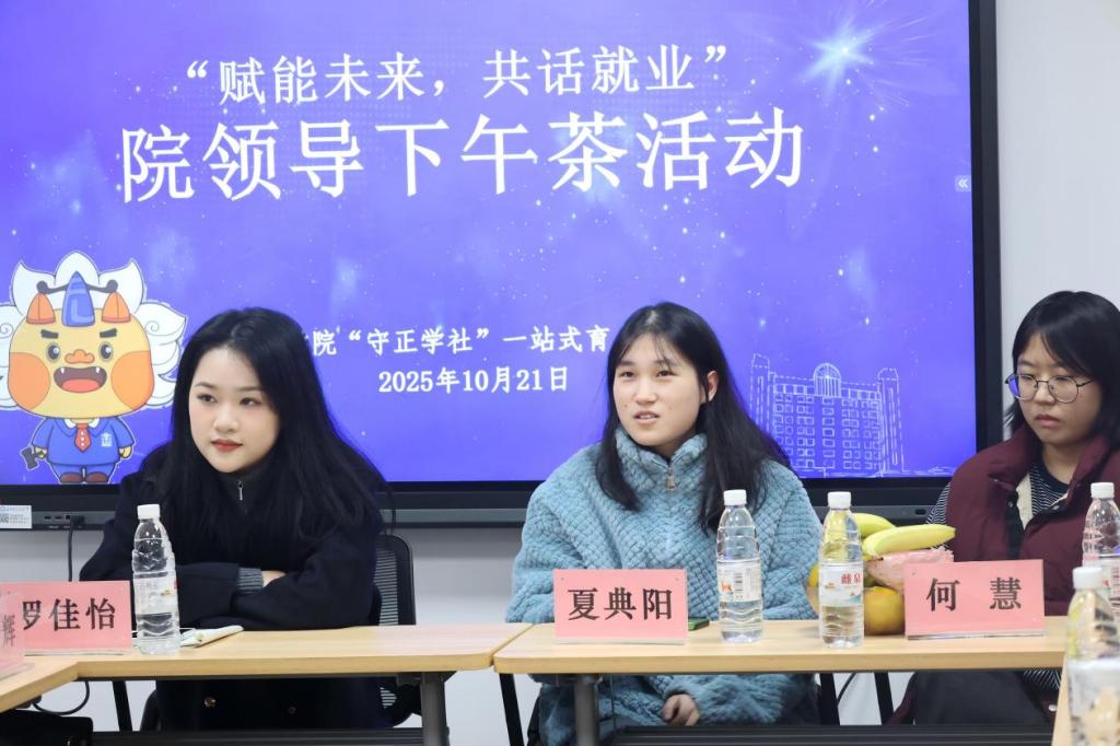 法学院“守正学社”一站式育人社区内茶香四溢,气氛温馨融洽。一场以“赋能未来,共话就业”为主题的院领导下午茶活动在此举行。学院学术院长吴勇、党委副书记汪伦、涉外法治系系主任王寰、法学系教师党支部书记胡俊、就业专干兰贵辉老师与16名2026届本科、研究生毕业生代表围坐一堂,聚焦法学学子面临的考研深造“攻坚战”与求职择业的“选择题”,进行了深入、坦诚、温馨地交流与探讨。