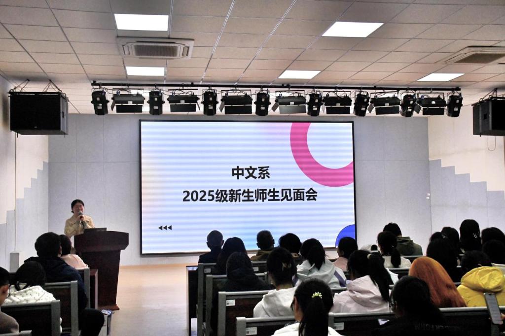 金盆岭校区9教113教室内,一场别开生面的新生见面会如期举行。由文新学院中文系精心组织,三十余位教师与汉语言文学专业2025级全体新生齐聚一堂,在院党委委员兼系主任黄婧老师的主持下,共同开启了一场名为“中文之约”的温暖旅程。