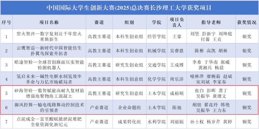 近日,中国国际大学生创新大赛2025年总决赛落下帷幕。土木与环境工程学院“砂海智砼一数智赋能高耐久复材筋增强地聚物海工混凝土”、“御风控舞一输电线路舞动控制技术的引领者”项目团队再创佳绩分别获高教主赛道、产业赛道铜奖。
