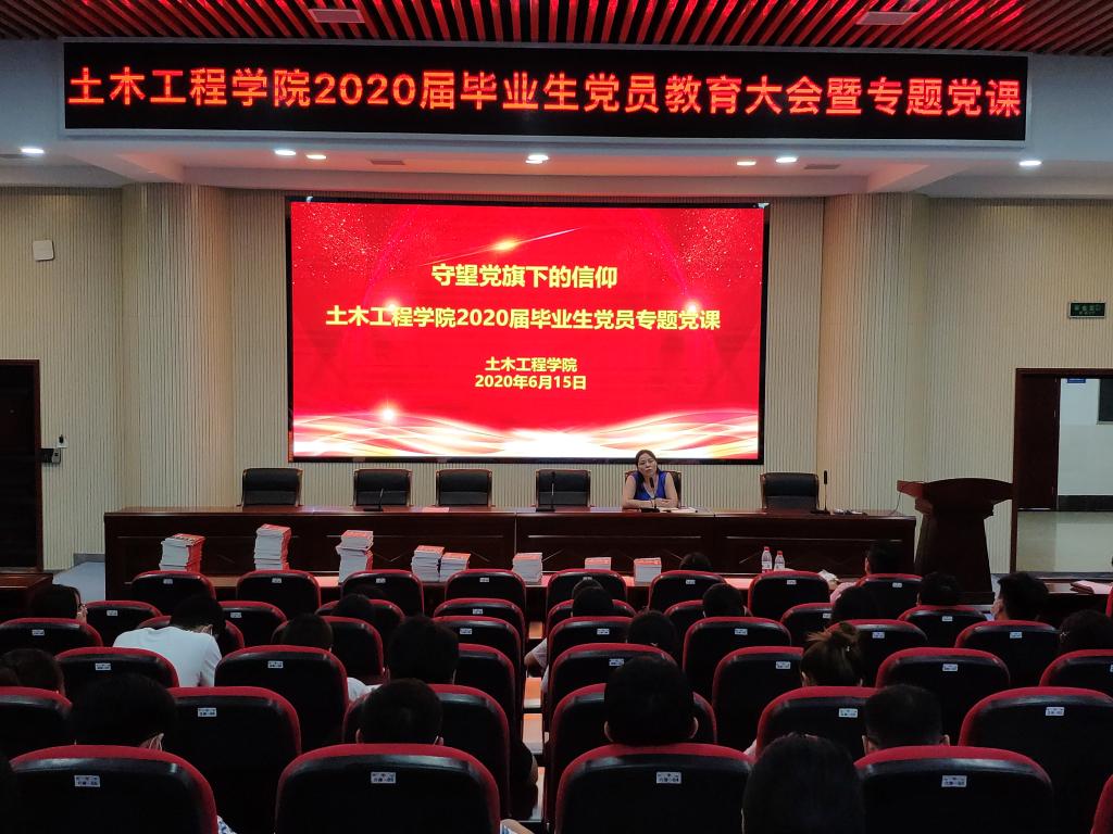 为深入学习领会习近平新时代中国特色社会主义思想,切实增强毕业生党员的政治意识、大局意识、核心意识、看齐意识,引导毕业生党员保持先进性,发挥模范带头作用,6月15日下午,土木工程学院2020届毕业生党员教育大会暨“守望党旗下的信仰”专题党课在工科二号楼报告厅举行。院党委副书记(主持工作)丁丹为毕业生党员带来了一堂生动的党课。党委副书记(代理)黄阿明,各学生党支部书记以及全体毕业生党员参加会议。会议由学生党总支副书记李小军主持。